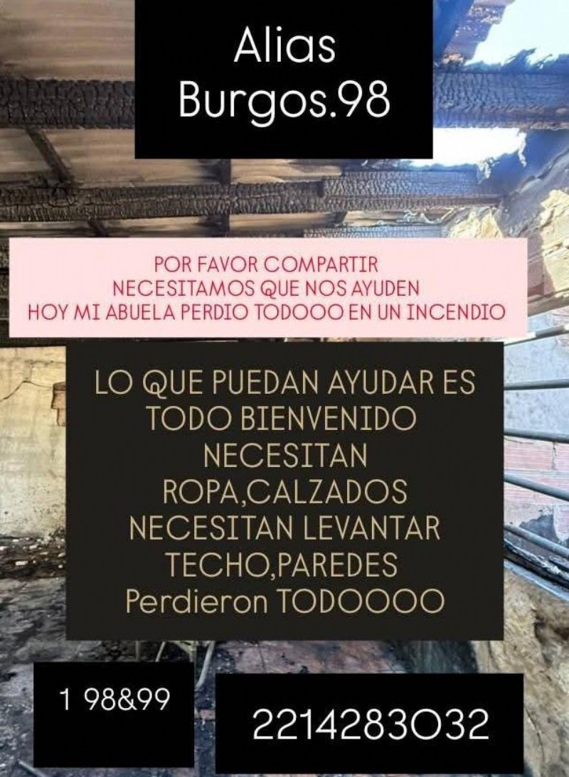 Al respecto, solicitó que “se le quemó todo, no le quedó nada, y estamos pasando un alias para que la gente pueda colaborar”.