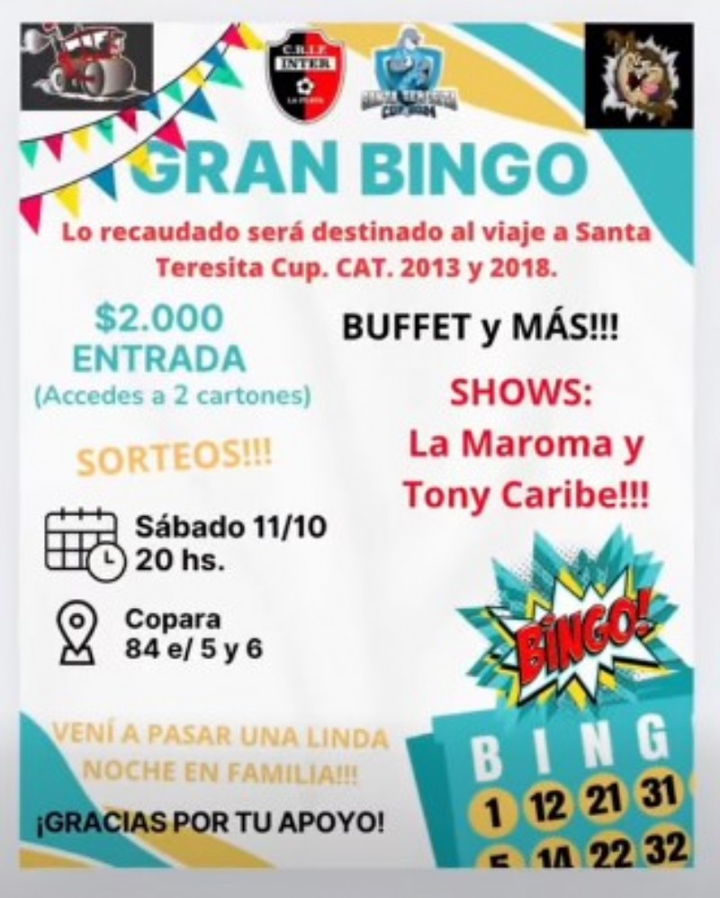 El sábado en el gimnasio de COPARA, 84 entre 5 y 6, el Centro Recreativo Infantil Inter de Villa Elvira, organizará un Bingo Solidario con el objetivo de recaudar fondos para cubrir gastos de lo que será el viaje para todas las categorías que asistirán al Santa Teresita CUP.
