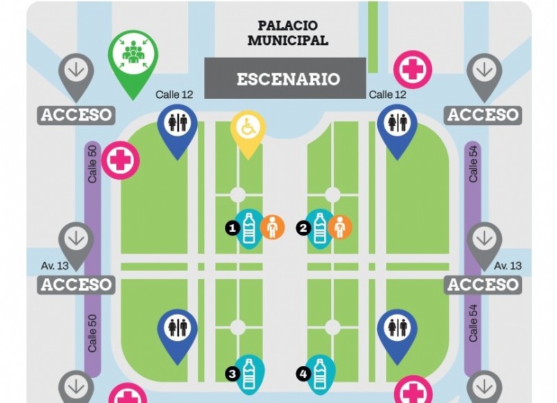 Los baños químicos estarán ubicados en 54 entre 12 y 13, 54 entre 13 y 14, 50 entre 12 y 13 y 50 entre 13 y 14. A su vez, se acondicionará un espacio especial cercano al escenario para personas con discapacidad en 12 y 51 y se instalarán pasillos gastronómicos en las calles 50 y 54 de 12 a 14.