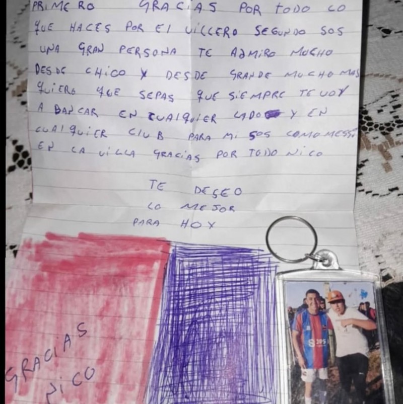 "Gracias por todo", "Para mi sos como Messi en el Villero", fueron algunas frases de la carta que demuestra el cariño y la admiración del hincha por el jugador.